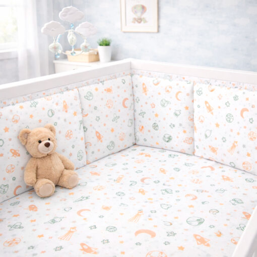 Bumper protector para cuna en polialgodón 50/50 con diseño espacio. Acolchado, suave y seguro. Protege al bebé de golpes contra los barrotes y se instala fácilmente con cintas de sujeción.