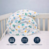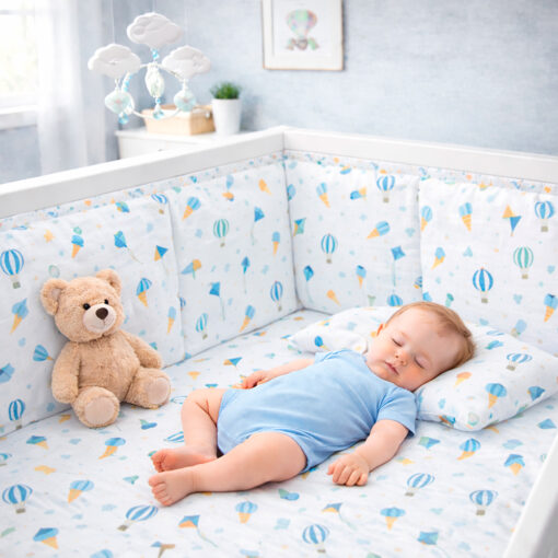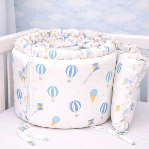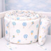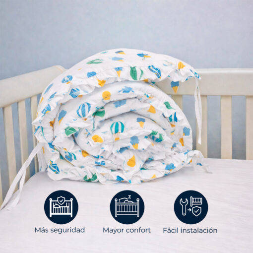 Bumper protector para cuna en polialgodón 50/50 con diseño de globos. Acolchado, suave y seguro. Protege al bebé de golpes contra los barrotes y se instala fácilmente con cintas de sujeción.