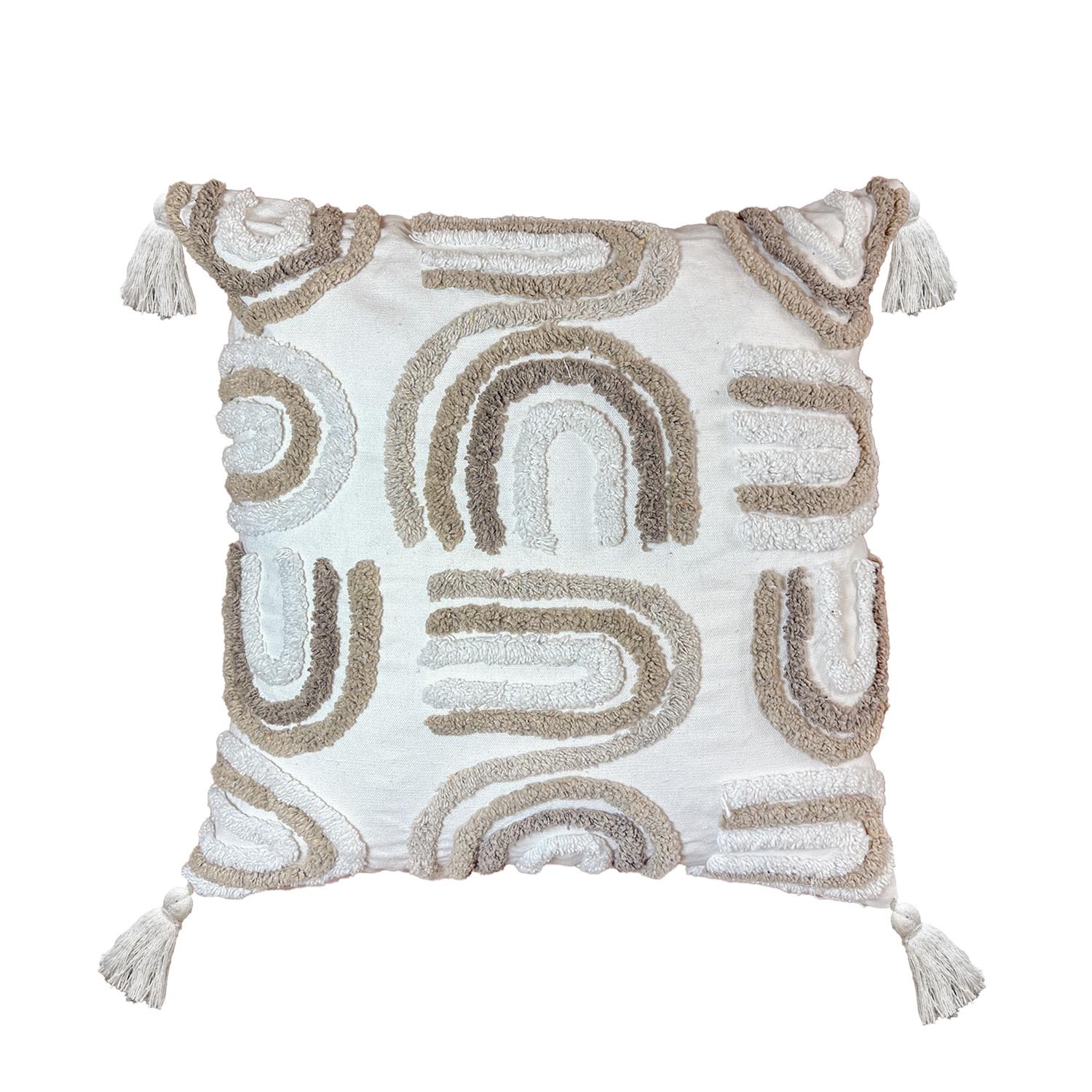 Cojín decorativo Rustic con diseño geométrico en relieve y flecos en las esquinas. Combina tonos beige y crudos que aportan un estilo boho y natural a tu sala o habitación.