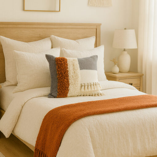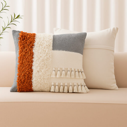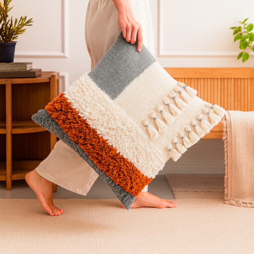 Su diseño combina bloques de color en tonos neutros y cálidos, con superficies contrastantes que incluyen tejido rústico, textura suave tipo borrego y detalles decorativos con borlas en relieve, creando un efecto visual lleno de carácter y profundidad.