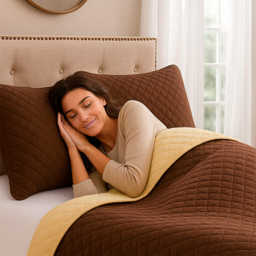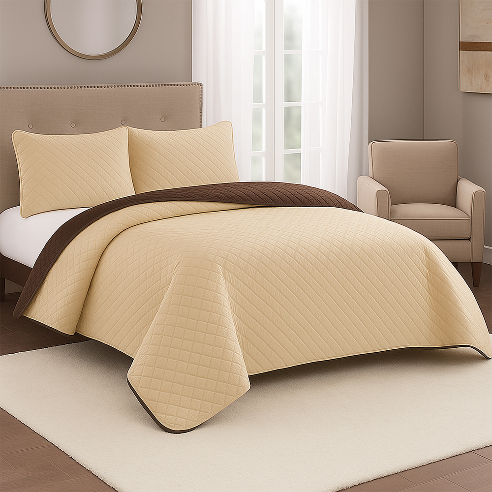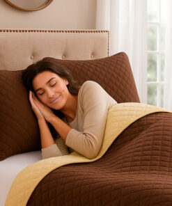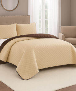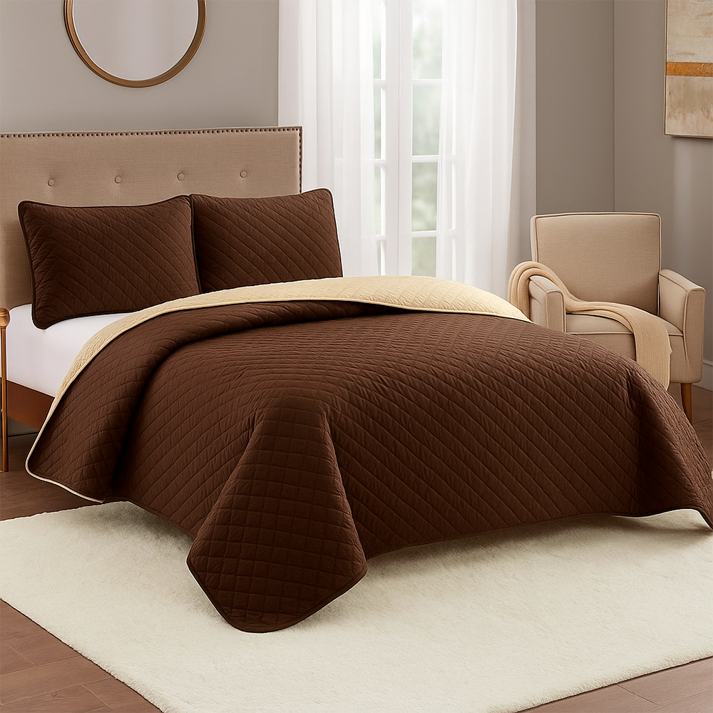 La combinación de tonos café y beige crea un ambiente cálido, acogedor y atemporal, ideal para estilos clásicos, modernos o naturales. Gracias a su confección ligera, esta colcha es perfecta para usar durante todo el año, ofreciendo abrigo suave sin exceso de peso.