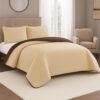 Colcha española microembosada en tonos café y beige. Diseño elegante, suave y liviano. Ideal para dar calidez y estilo a tu cama durante todo el año.