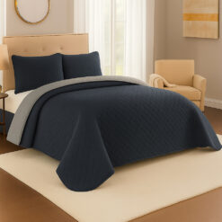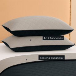 Colcha española microembosada en gris claro y azul oscuro. Diseño moderno, suave y liviano. Ideal para vestir tu cama con elegancia y confort todo el año.