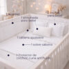 Set completo de cuna con bumper, juego de sábanas, cojines, almohada y protector antifluido. Suavidad, protección y diseño ideal para el descanso del bebé.