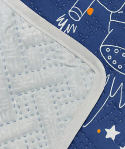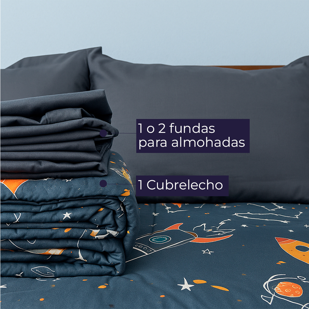 Cubrelecho infantil con diseño de astronautas, cohetes y estrellas en azul espacial. Suave, hipoalergénico, ligero y resistente. Incluye 1 o 2 fundas para almohadas. Ideal para cuartos temáticos y niños amantes del espacio.