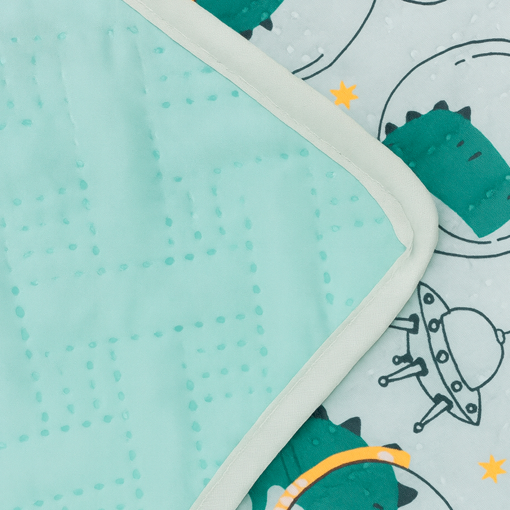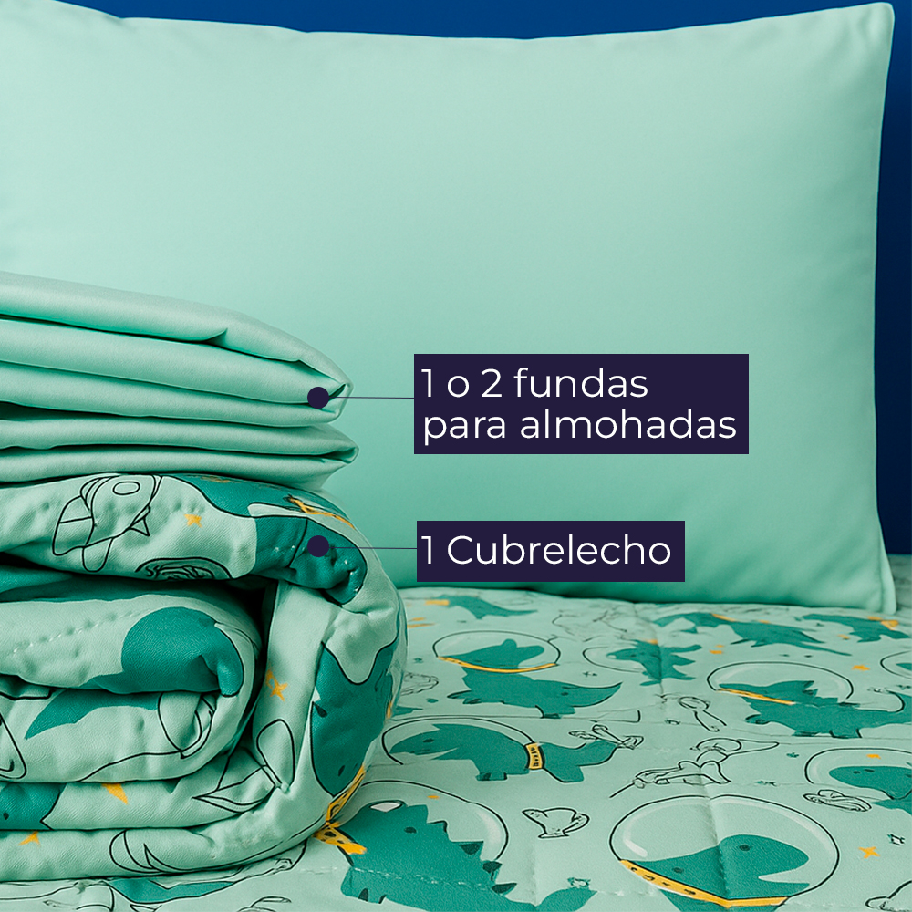 Cubrelecho infantil con diseño de dinosaurios astronautas en tono verde aqua. Suave, hipoalergénico y ligero. Incluye 1 o 2 fundas para almohadas. Perfecto para transformar el cuarto de tu hijo en un espacio lleno de aventura.