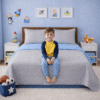 Cubrelecho infantil doble faz en microfibra azul celeste y gris, suave y acolchado. Ideal para un espacio moderno, cómodo y fácil de mantener.