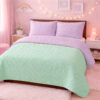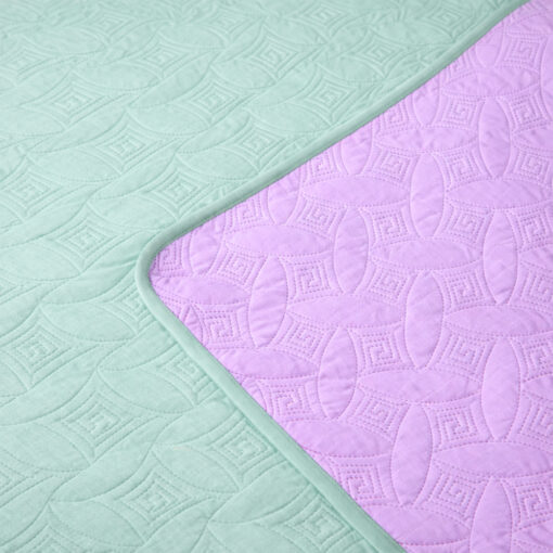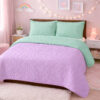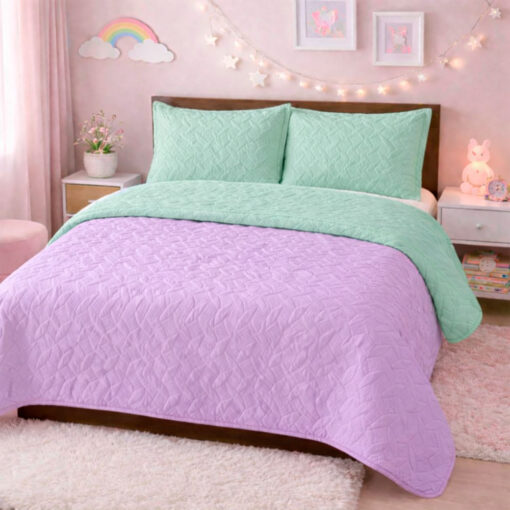Cubrelecho infantil doble faz en lila y verde menta, suave y acolchado. Ideal para transformar el cuarto con estilo y comodidad.