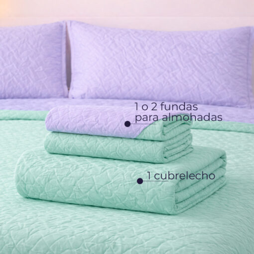 Dale un toque de suavidad, color y estilo al cuarto de los más pequeños con este cubrelecho infantil doble faz en tonos lila y verde menta. Su diseño acolchado crea una textura elegante y acogedora, mientras que su combinación de colores aporta un ambiente cálido, tranquilo y moderno.