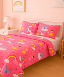 Cubrelecho infantil rosa con diseño de princesas, castillos y arcoíris. Suave, hipoalergénico, liviano y resistente. Incluye 1 o 2 fundas para almohadas. Ideal para transformar la habitación de tu hija en un mundo mágico.