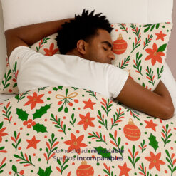Este diseño combina tonos tradicionales de la Navidad con ilustraciones de flores de pascua (estrella de Navidad), hojas verdes, ramas ornamentales y esferas decorativas sobre un fondo crema suave, logrando un estilo festivo, natural y acogedor.