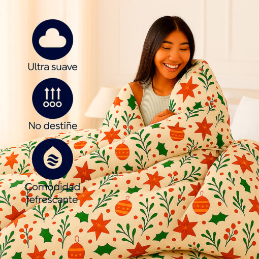 Duvet navideño doble faz con diseño clásico en tonos verde, rojo y crema. Ultra suave, no destiñe y con doble cierre cremallera. Incluye sábana ajustable y fundas. Perfecto para crear una habitación cálida y festiva
