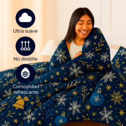 Edredón navideño doble faz con diseño azul noche y detalles dorados. Ultra suave, liviano y no destiñe. Incluye fundas. Perfecto para darle un toque elegante y festivo a tu habitación.