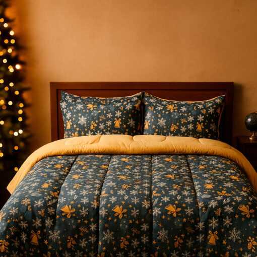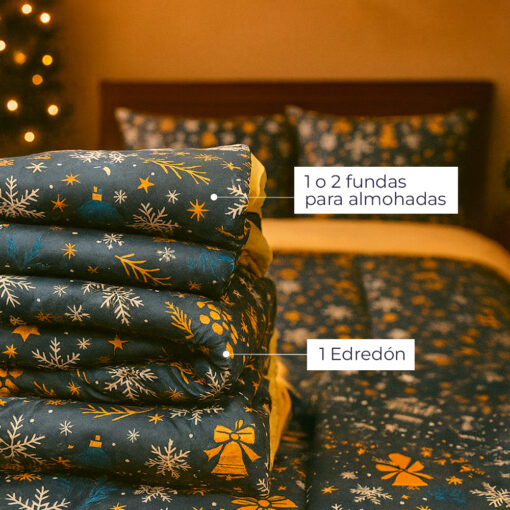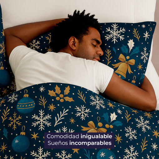 Edredón navideño doble faz con diseño azul noche y detalles dorados. Ultra suave, liviano y no destiñe. Incluye fundas. Perfecto para darle un toque elegante y festivo a tu habitación.