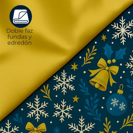 Su estampado combina motivos navideños en tonos azul noche, dorado y blanco, con ilustraciones de copos de nieve, ramas invernales, campanas, esferas y detalles que evocan la magia de la Navidad. El fondo azul profundo aporta sofisticación, mientras que el reverso en tono mostaza suave crea un contraste moderno y elegante gracias a su diseño doble faz.