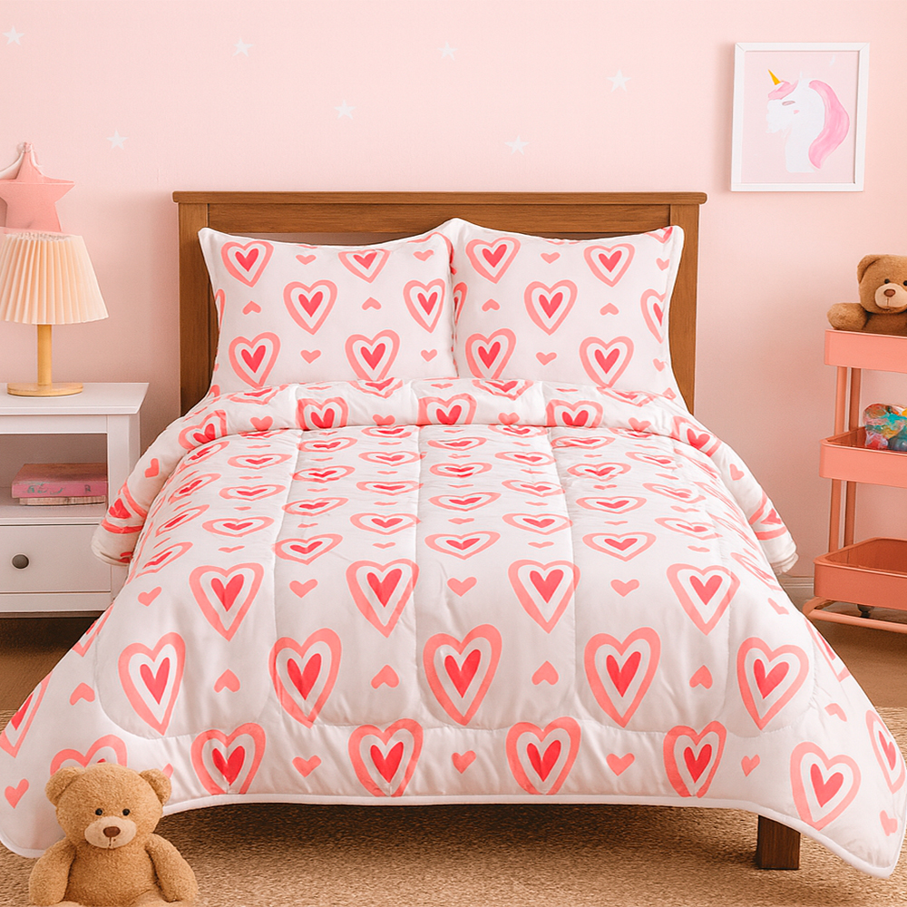 El Edredón Infantil Corazones Rosados de Casa LILÉ está diseñado para llenar la habitación de amor, suavidad y dulzura.