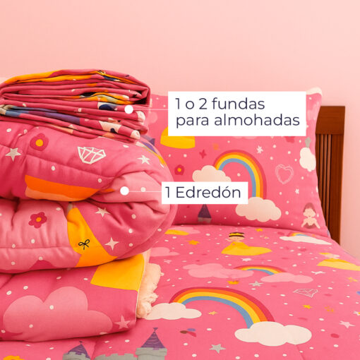 Su alegre estampado con princesas, unicornios, castillos y arcoíris invita a soñar, jugar y disfrutar de noches cálidas y confortables.