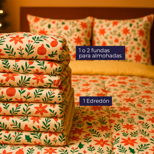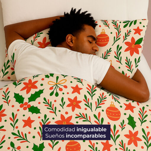 Edredón navideño doble faz con diseño clásico de flores y ramas en tonos rojo, verde y marfil. Ultra suave, liviano y no destiñe. Incluye fundas para almohada. Perfecto para crear una habitación cálida y festiva.
