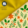 Su estampado presenta flores de pascua, ramas decorativas, hojas verdes y esferas navideñas sobre un fondo marfil cálido, creando un ambiente festivo, delicado y acogedor.