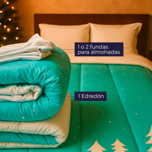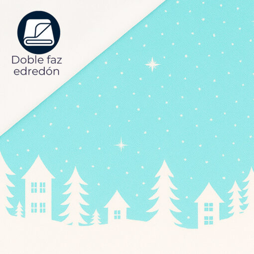 Edredón navideño doble faz en tono azul invierno. Ultra suave, no destiñe y brinda comodidad fresca. Diseño invernal con estrellas, casas y pinos. Perfecto para transformar tu habitación esta Navidad.