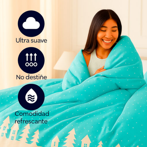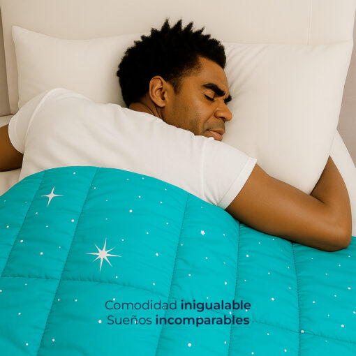 Su tela es ultra suave, resistente, no destiñe y es ideal para quienes disfrutan un descanso fresco y cómodo durante todo el año. Además, su relleno acolchado mantiene la temperatura justa para noches más templadas o cálidas.