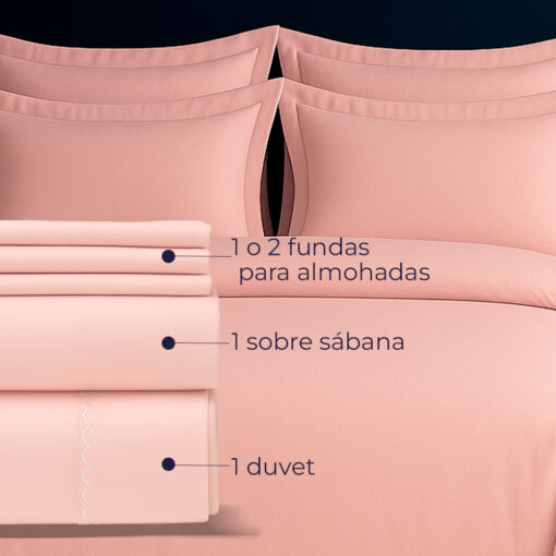 Juego de duvet 300 hilos palo rosa en polialgodón 60% algodón y 40% poliéster. Suave, duradero, apto para secadora y con cierre doble cremallera.