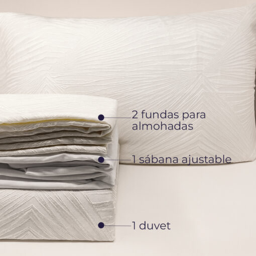 Fabricado en tela jacquard premium, este set asegura suavidad, frescura y resistencia al desgaste, ideal para quienes buscan una experiencia de descanso superior. Además, está diseñado para brindar practicidad y estilo, incluyendo funda duvet, sábana ajustable y fundas de almohada.