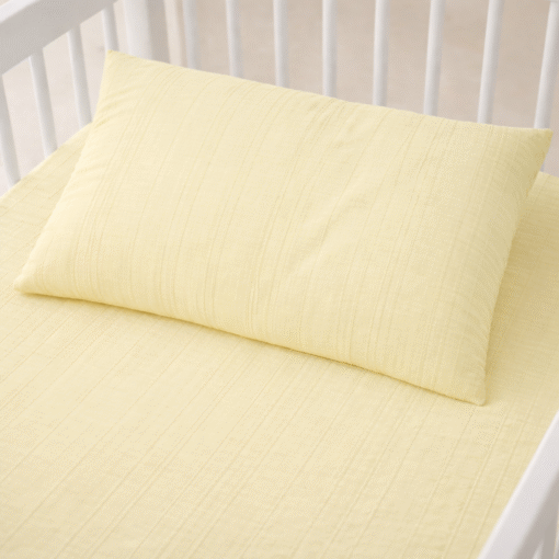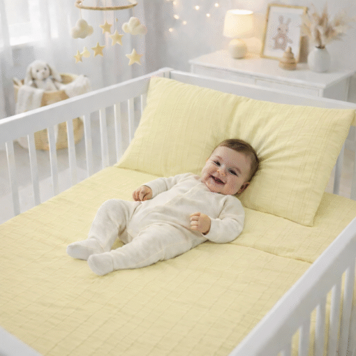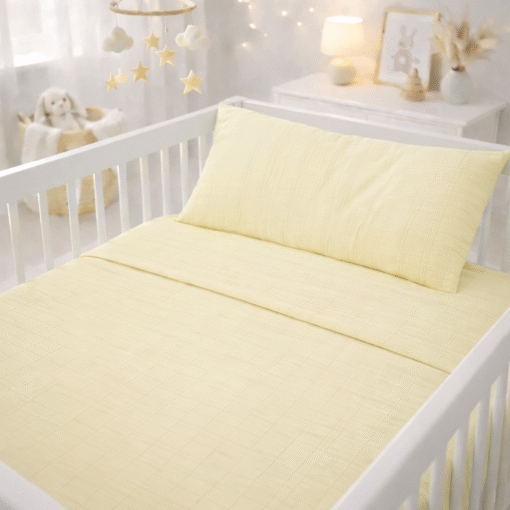 Dale a tu bebé un descanso suave, fresco y natural con nuestro juego de sábanas para cuna en tono amarillo suave, confeccionado en 100% algodón. Su textura delicada permite una excelente transpirabilidad, ideal para cuidar la piel sensible del bebé y brindar mayor confort durante el descanso.