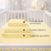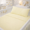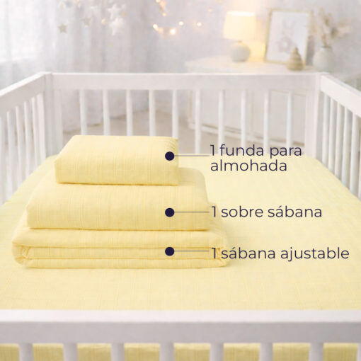 Juego de sábanas para cuna amarillo suave 100% algodón, fresco y delicado. Incluye sábana ajustable, sobre sábana y funda. Ideal para el descanso cómodo del bebé.