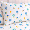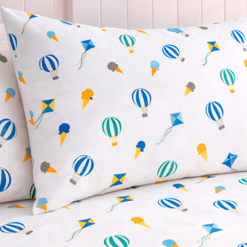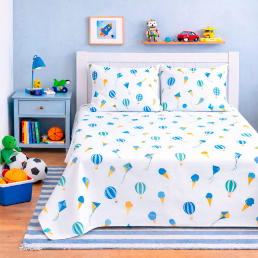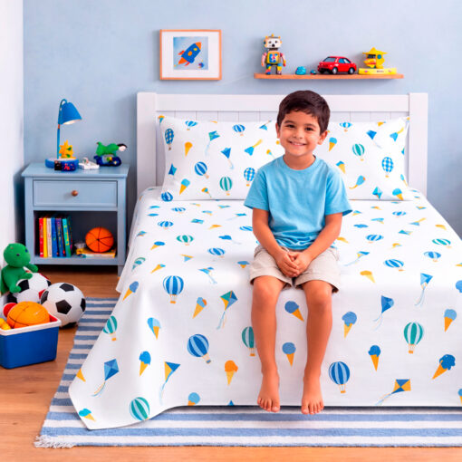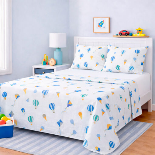 El Juego de Sábanas Polialgodón Globos para Niño Casa Lilé llena la habitación de energía y diversión con su diseño de globos aerostáticos, cometas y detalles coloridos.