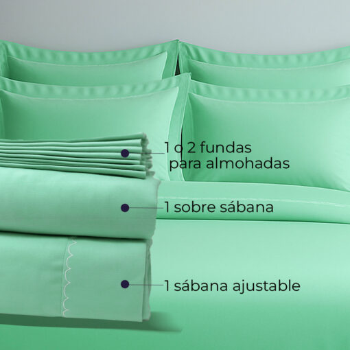 Contiene: 1 sábana ajustable, 1 sobre sábana y 1 funda lisa para almohada para la cama sencilla y 2 para las medidas semidoble, doble, queen y king.