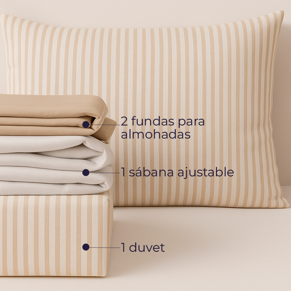 Fabricado en tela catiónica premium, este set ofrece una textura ultra suave, fresca y resistente al uso diario. Su tecnología permite que los colores se mantengan vibrantes y no destiñan con los lavados. Además, incluye funda duvet, sábana ajustable y fundas de almohada para vestir tu cama con armonía y estilo.