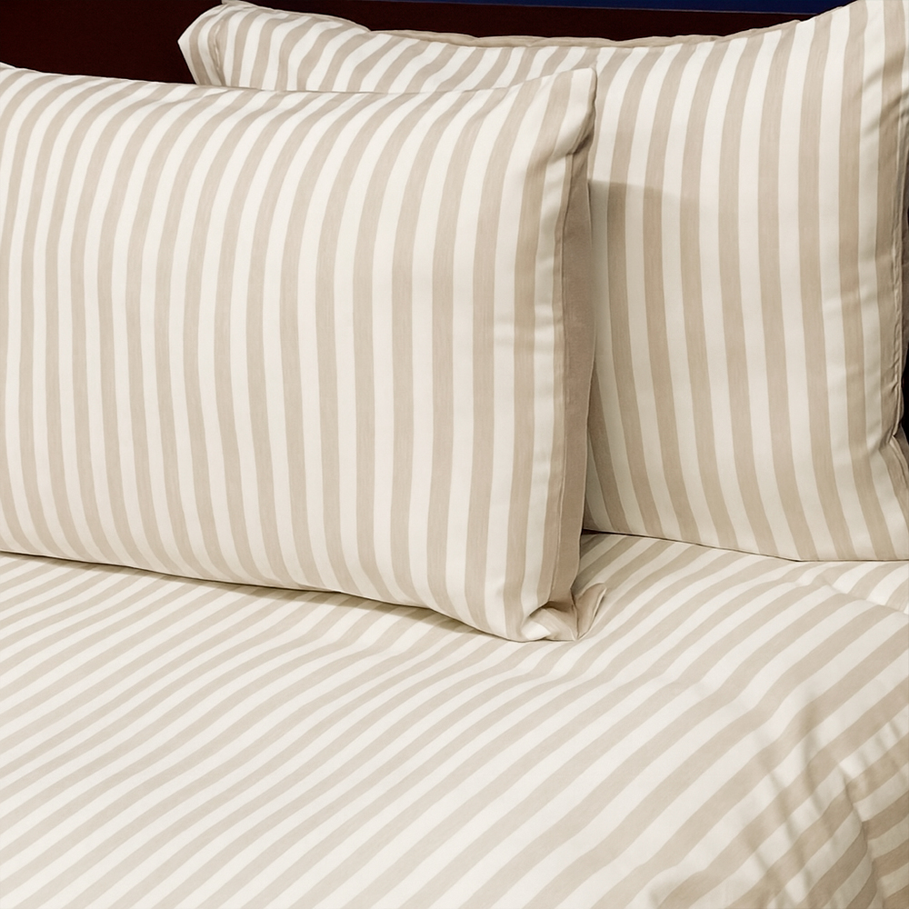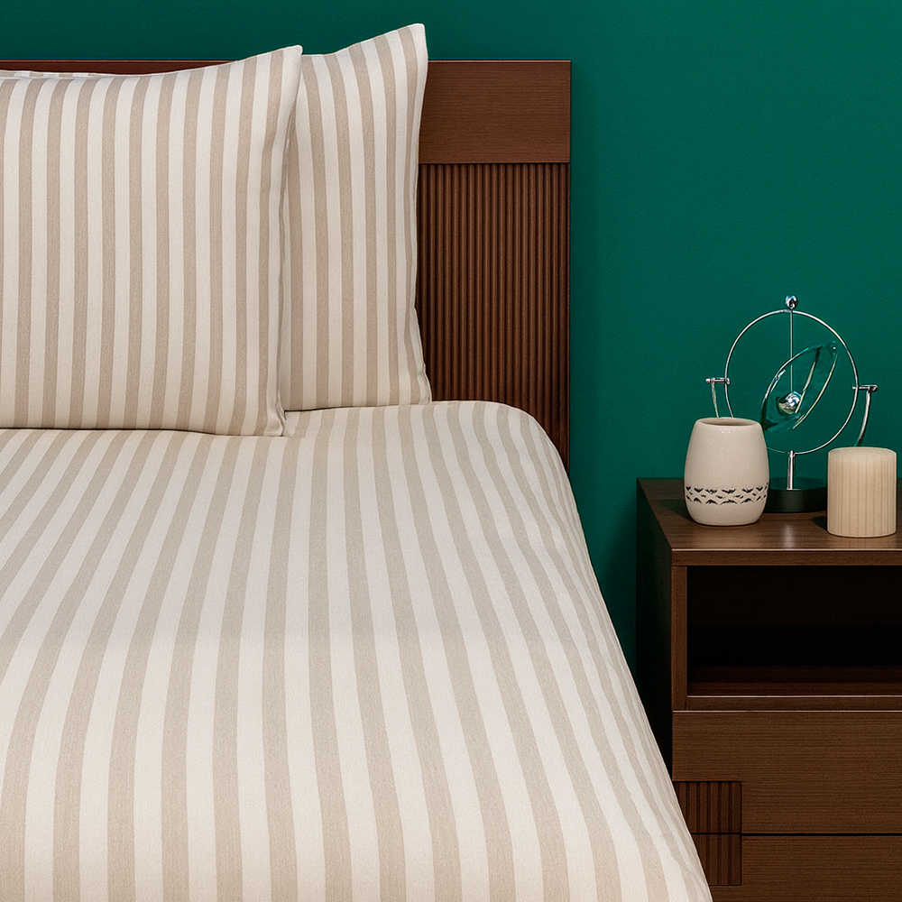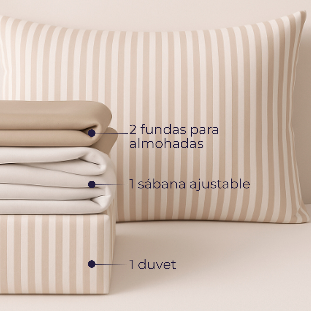 El Juego de Duvet Catiónico Café Raya Media combina el confort y la sofisticación de la tela catiónica con un diseño de rayas verticales en tonos tierra y beige que aportan armonía y calidez a tu habitación. Su textura ultra suave y su aspecto natural hacen de este set una elección perfecta para quienes buscan equilibrio entre estilo y bienestar.
