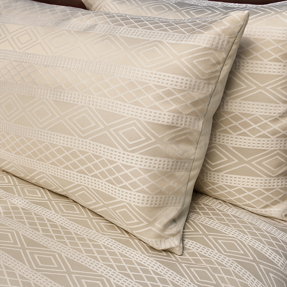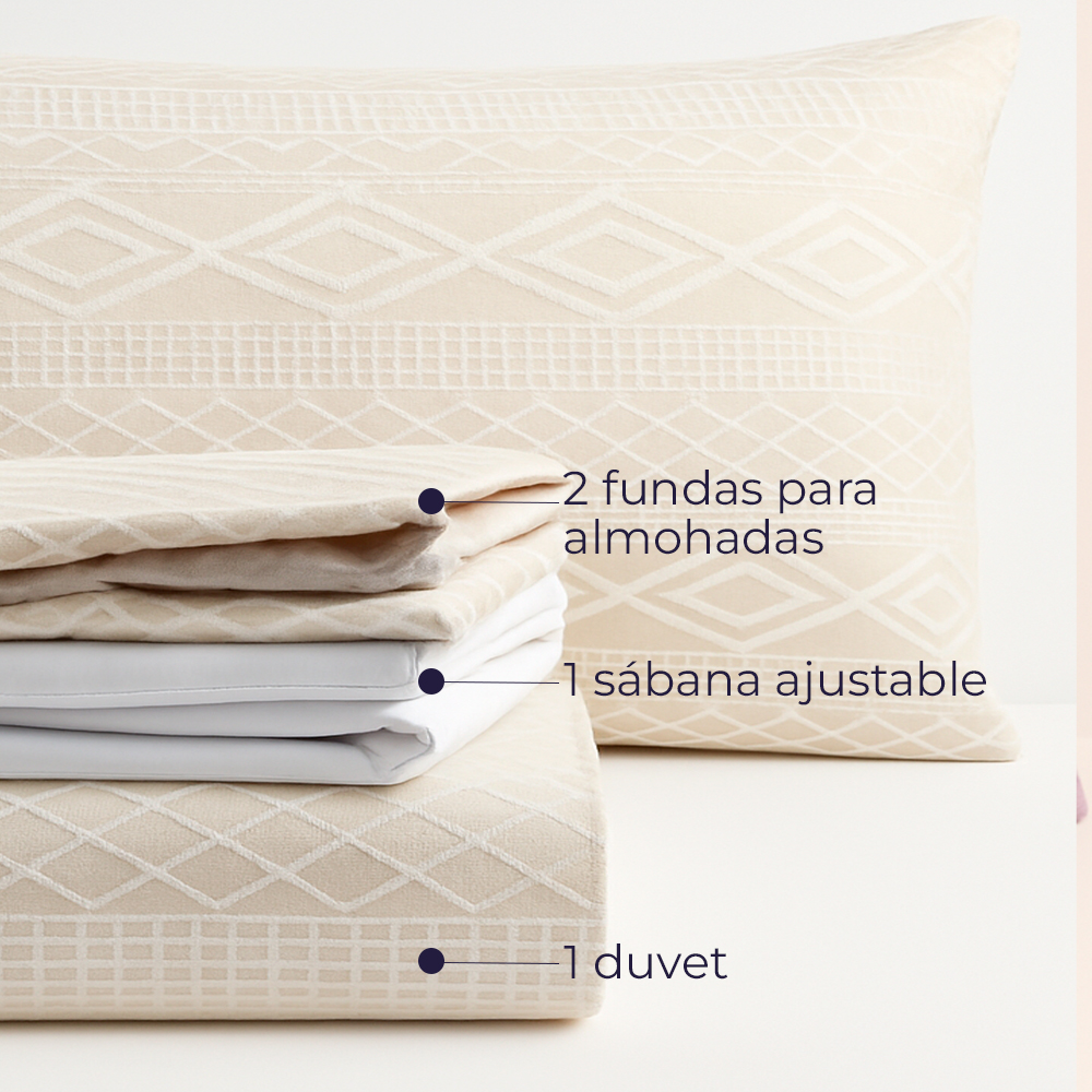 Aporta elegancia y modernidad a tu habitación con el Juego de Duvet Jacquard Geométrico Beige. Su diseño en relieve con figuras geométricas y líneas finas transmite un estilo contemporáneo y minimalista, ideal para espacios luminosos y acogedores.