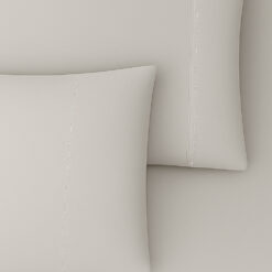 Juego de sábanas 300 hilos en polialgodón (60% algodón – 40% poliéster) en color gris. Ultra suaves, frescas, resistentes y con ajuste perfecto para colchones de 35 a 40 cm. Detalle decorativo ondulado en las fundas.