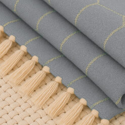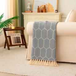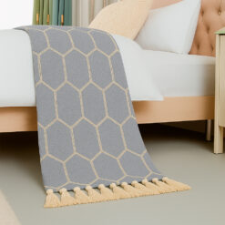 El tejido premium con textura suave y diseño geométrico tipo rombo aporta un toque contemporáneo y equilibrado, mientras que los flecos artesanales en los extremos agregan un detalle decorativo único y acogedor.