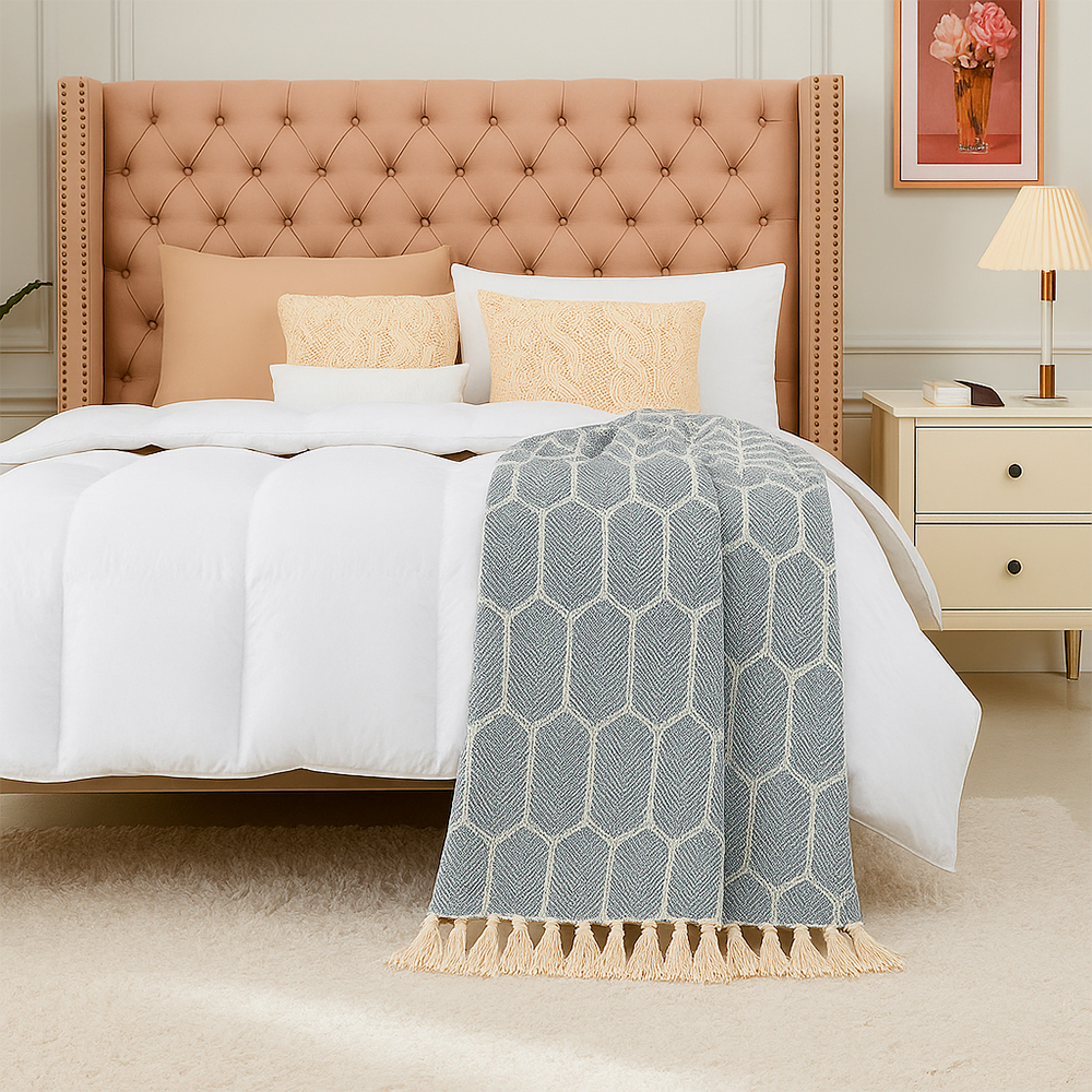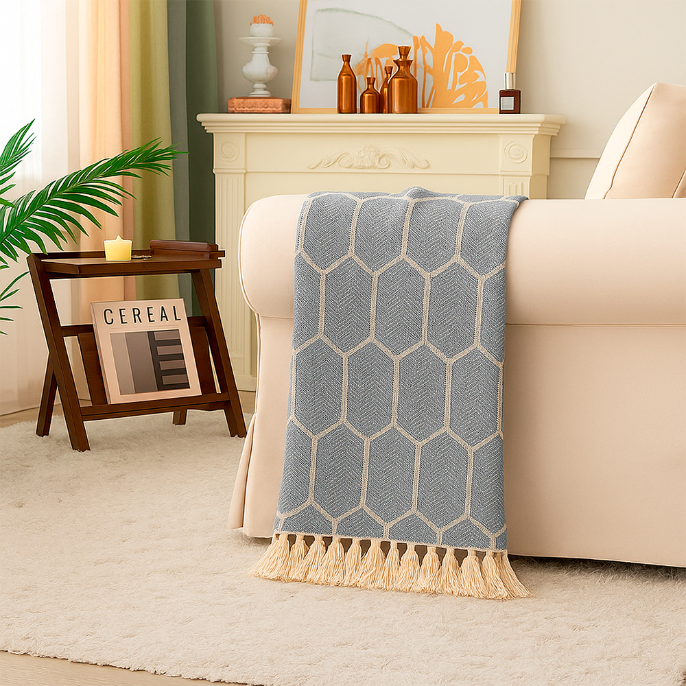 El tejido premium con textura suave y diseño geométrico tipo rombo aporta un toque contemporáneo y equilibrado, mientras que los flecos artesanales en los extremos agregan un detalle decorativo único y acogedor.