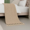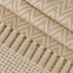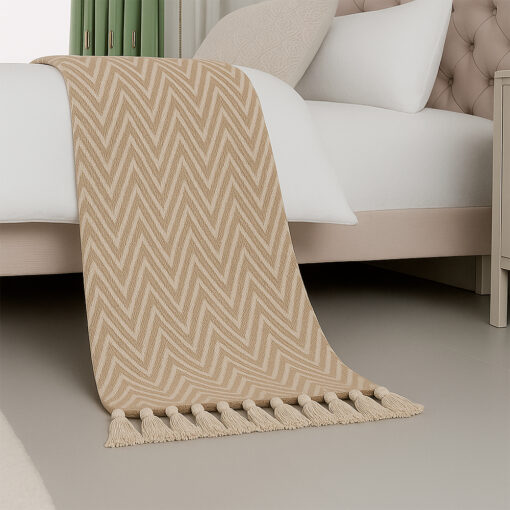 Pie de cama decorativo beige con diseño zig zag y flecos artesanales. Suave, moderno y perfecto para complementar camas y sofás. Ideal para crear ambientes cálidos y elegantes.