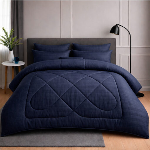 Plumón Azul Oscuro Embozado Premium + set de fundas. Diseño elegante, ultra suave y cálido. No destiñe, no genera ácaros y mantiene su forma lavado tras lavado. Ideal para un dormitorio sofisticado y acogedor.