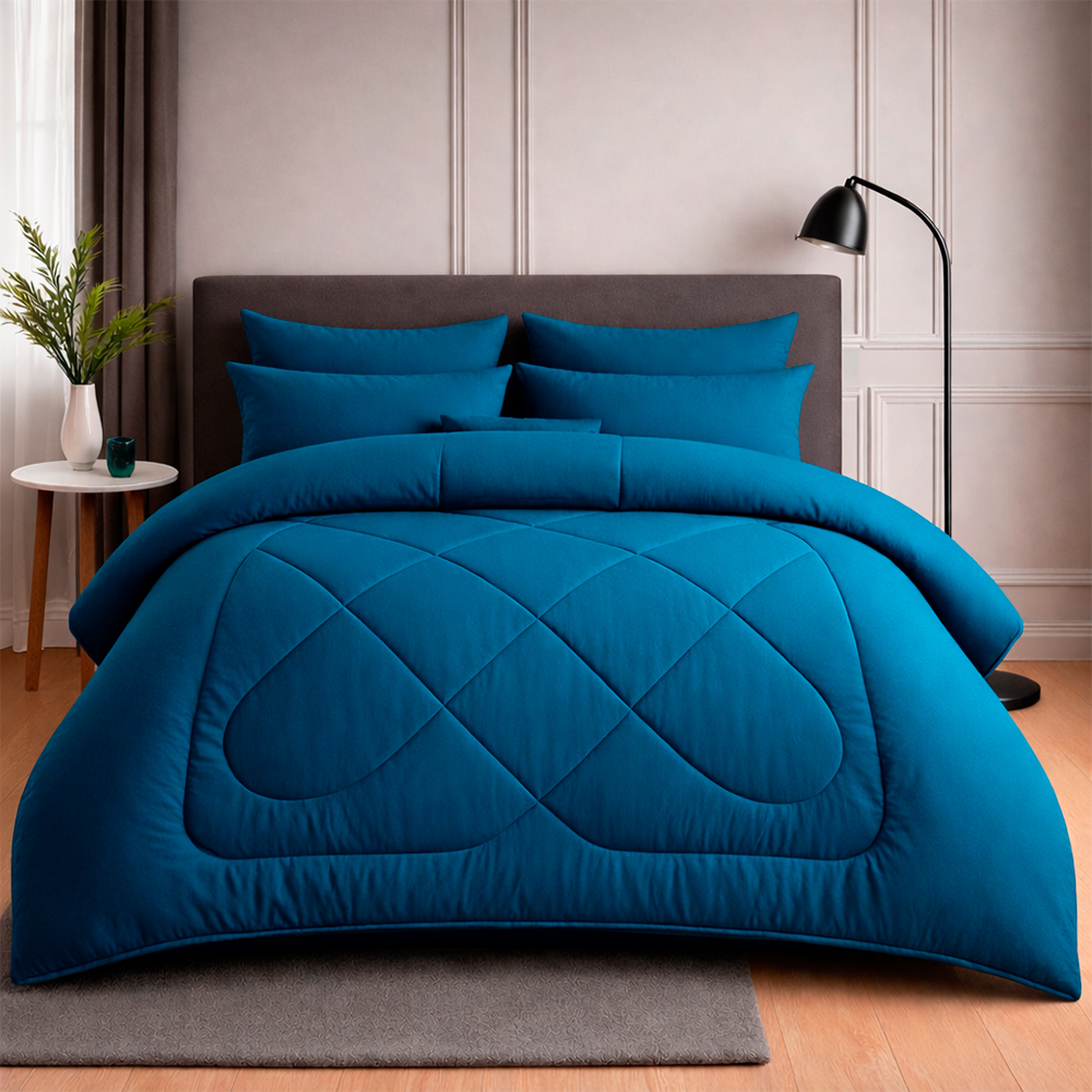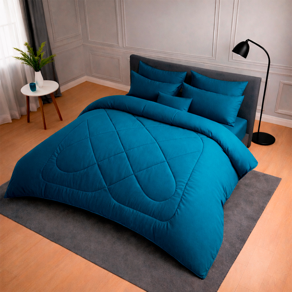 Plumón Azul Petróleo ultra suave, acolchado y térmico. No destiñe, no genera ácaros y brinda sensación cálida sin exceso de peso. Ideal para un dormitorio moderno y elegante.