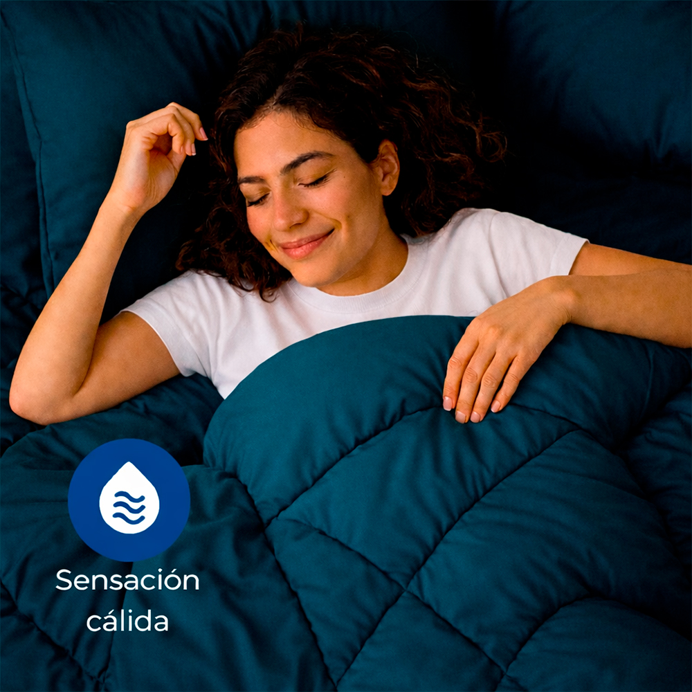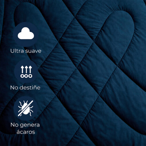 Está confeccionado con tela ultra suave al tacto, relleno ligero de excelente volumen y diseño acolchado que distribuye el calor de manera uniforme, brindando una sensación cálida sin exceso de peso.