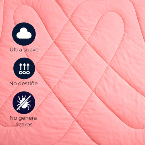 Su relleno liviano proporciona abrigo ideal sin generar peso excesivo, permitiendo un descanso profundo y placentero durante todo el año. La textura es ultra suave al tacto, no destiñe con los lavados y no genera ácaros, lo que lo convierte en una opción perfecta para personas con piel sensible o alergias.