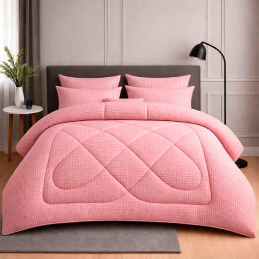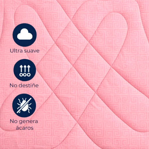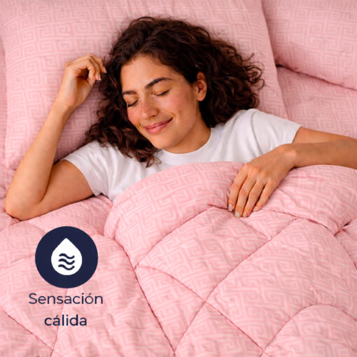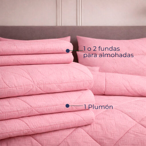 Plumón acolchado con set de fundas en microfibra suave y ligera. Brinda abrigo confortable, no destiñe y mantiene su forma. Ideal para climas frescos y para dar un toque moderno al dormitorio.