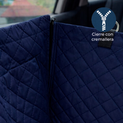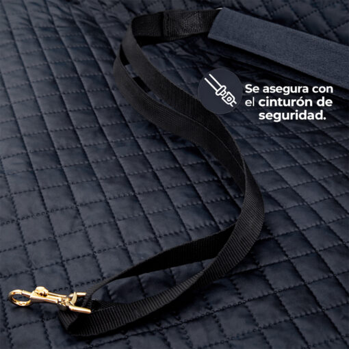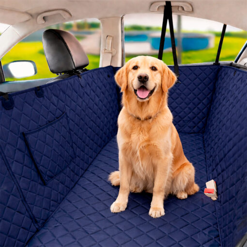 Viaja tranquilo con tu mascota usando este protector premium para silla trasera de carro. Impermeable, cómodo y seguro, protege de rasguños, manchas y pelos, con aberturas para cinturones
