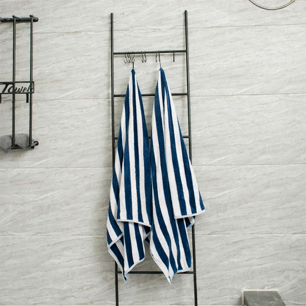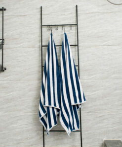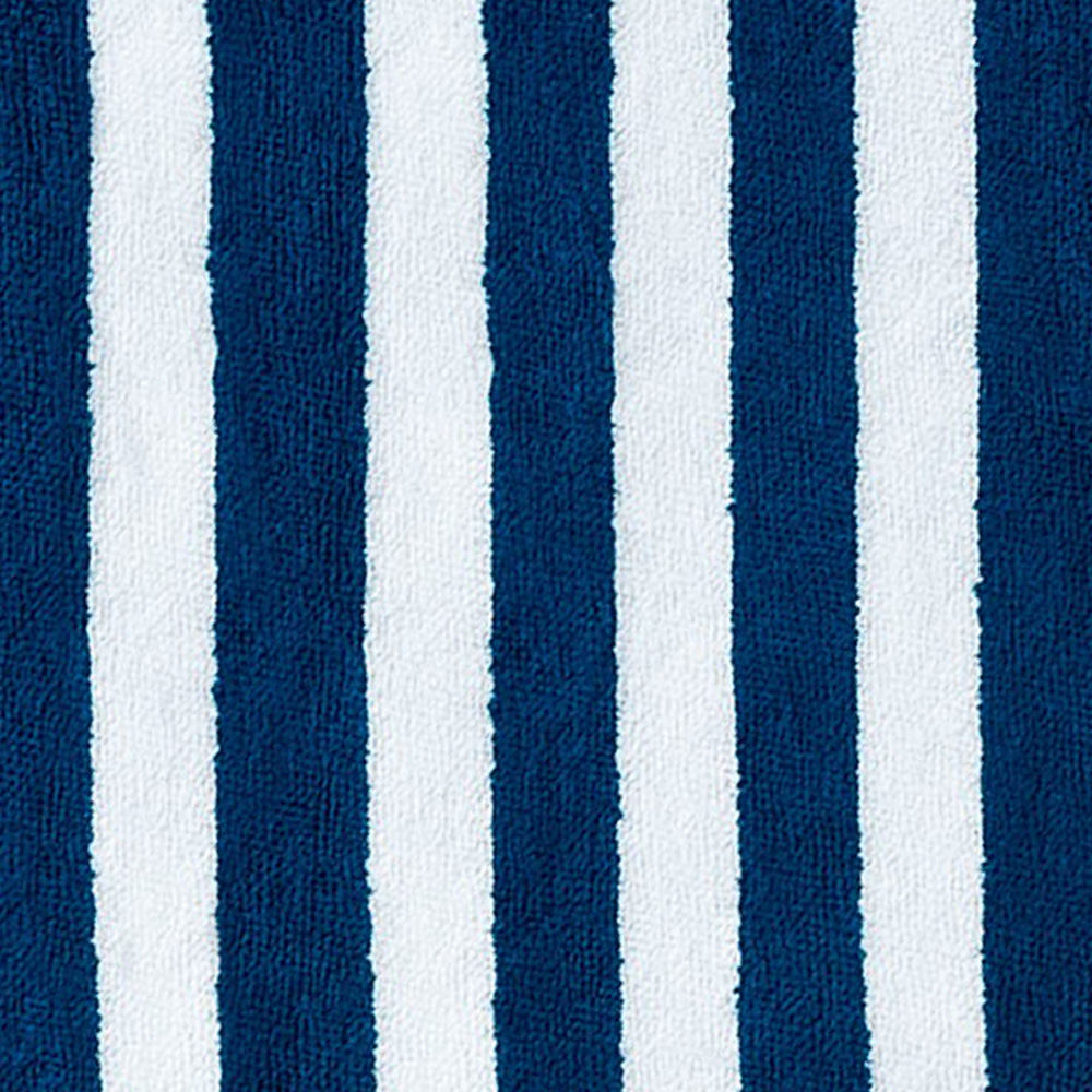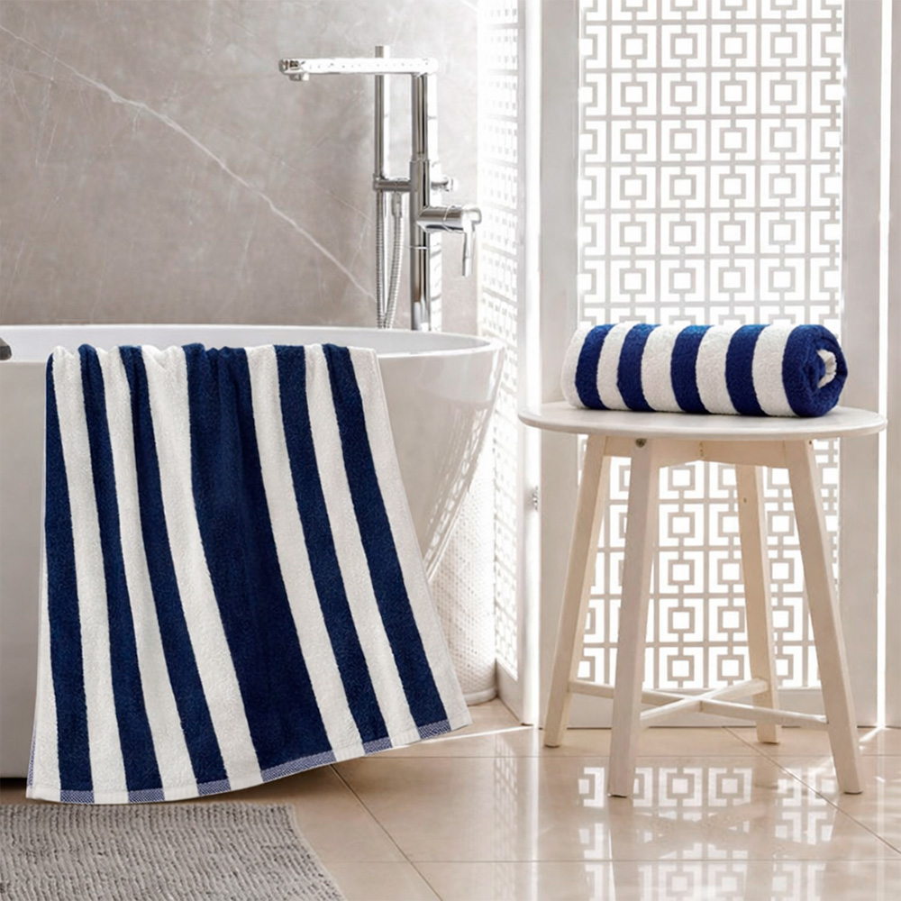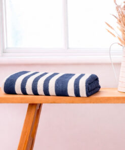 Su diseño de rayas azul oscuro y blanco transmite un estilo fresco y clásico, perfecto para playa, piscina o uso diario en casa. Elaborada con fibras suaves y de excelente capacidad de absorción, permite un secado eficiente mientras cuida la piel.